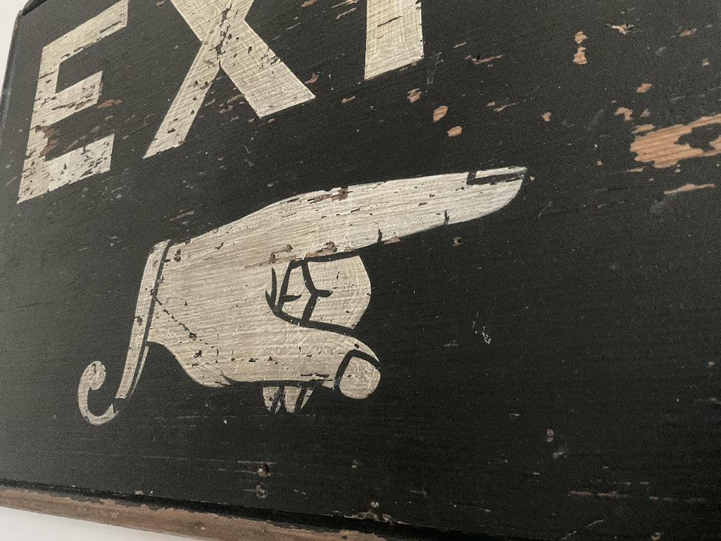 A Stylish Hand-Painted Wooden 'Exit' Sign with traditional sign-written Manicule, once situated in an automotive garage.