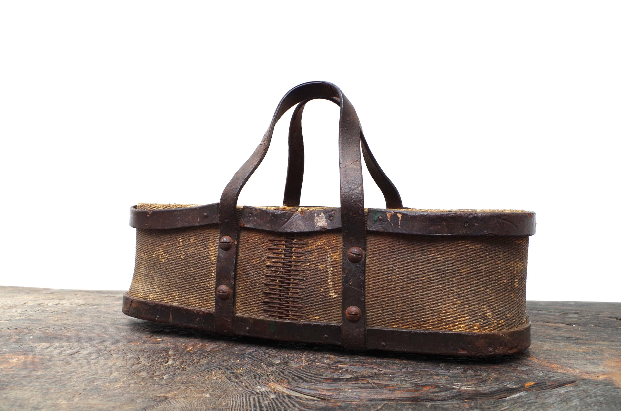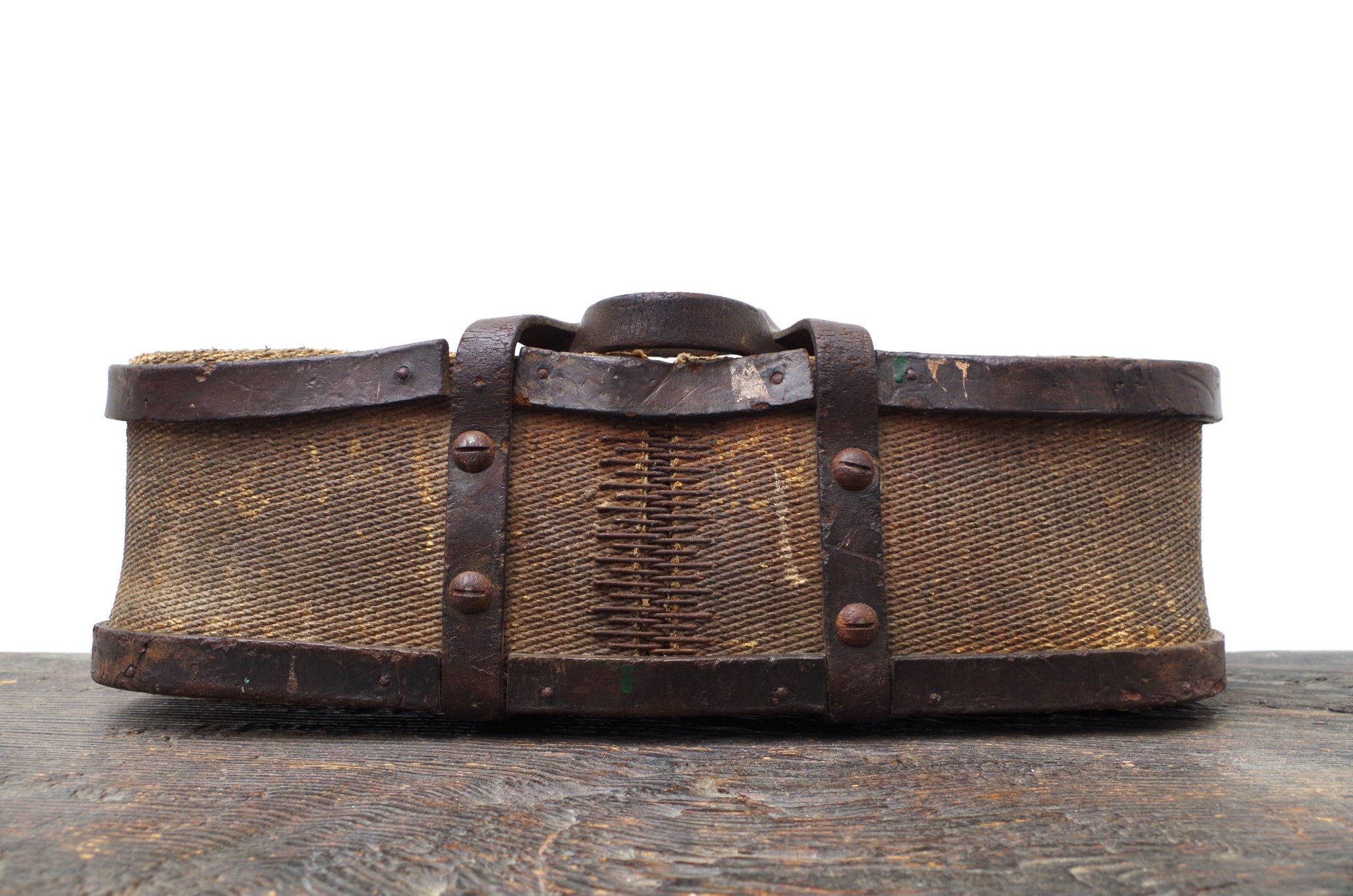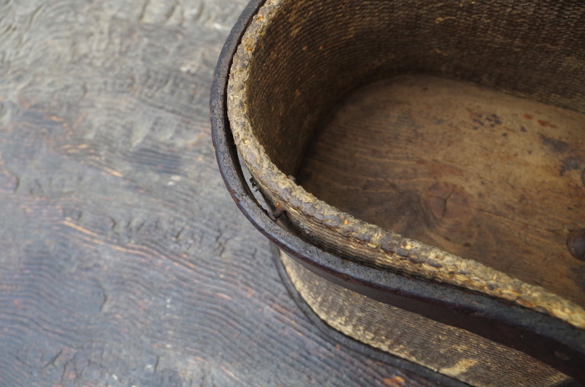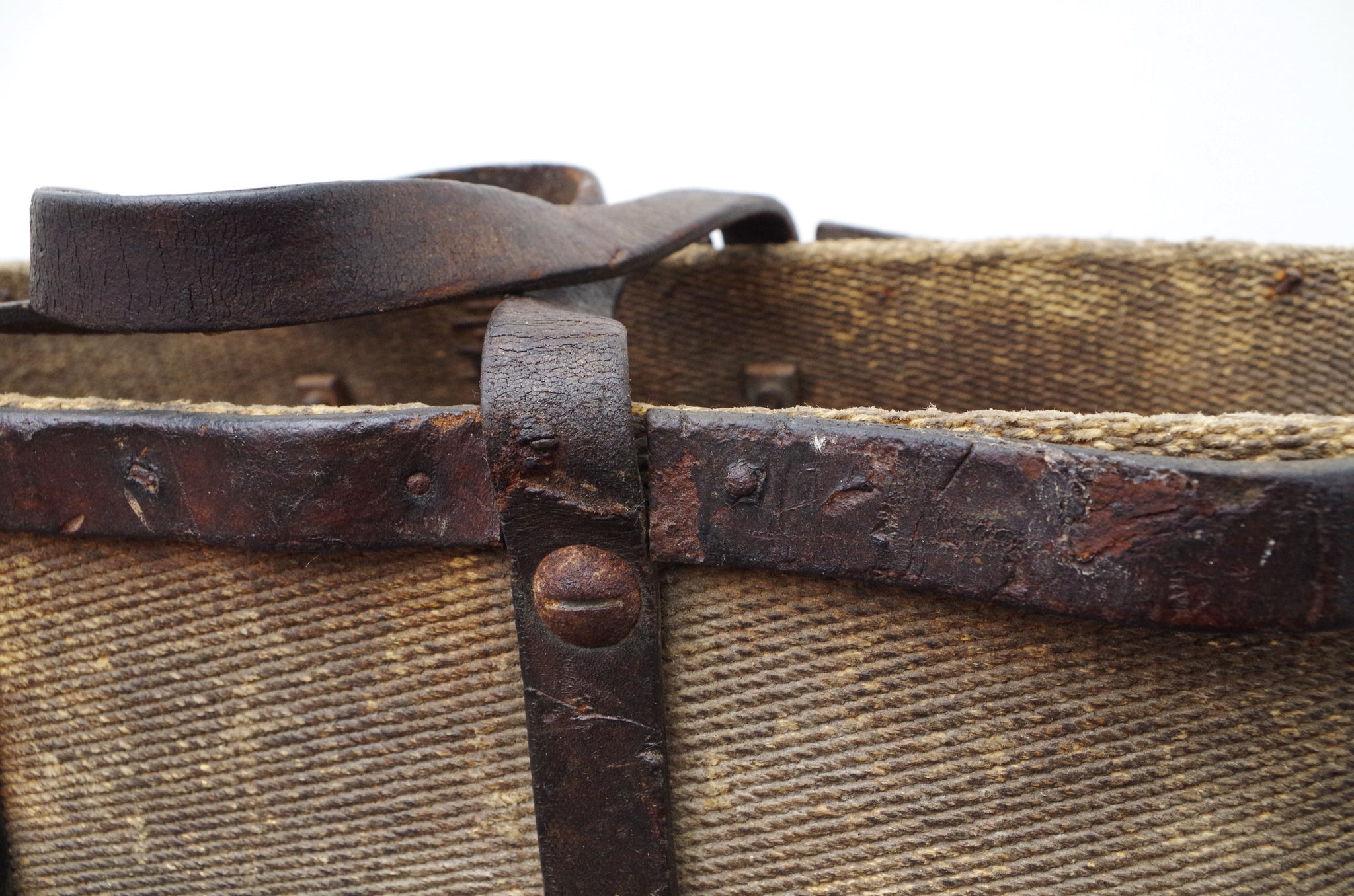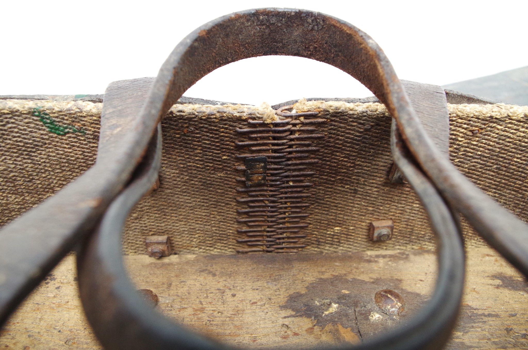 Handmade using leather horse harness strapping and 6mm corded canvas webbing, wired together at the front and attached to a wooden pine base. It's full of character with clever use of materials. An unusual hand-crafted survivor.