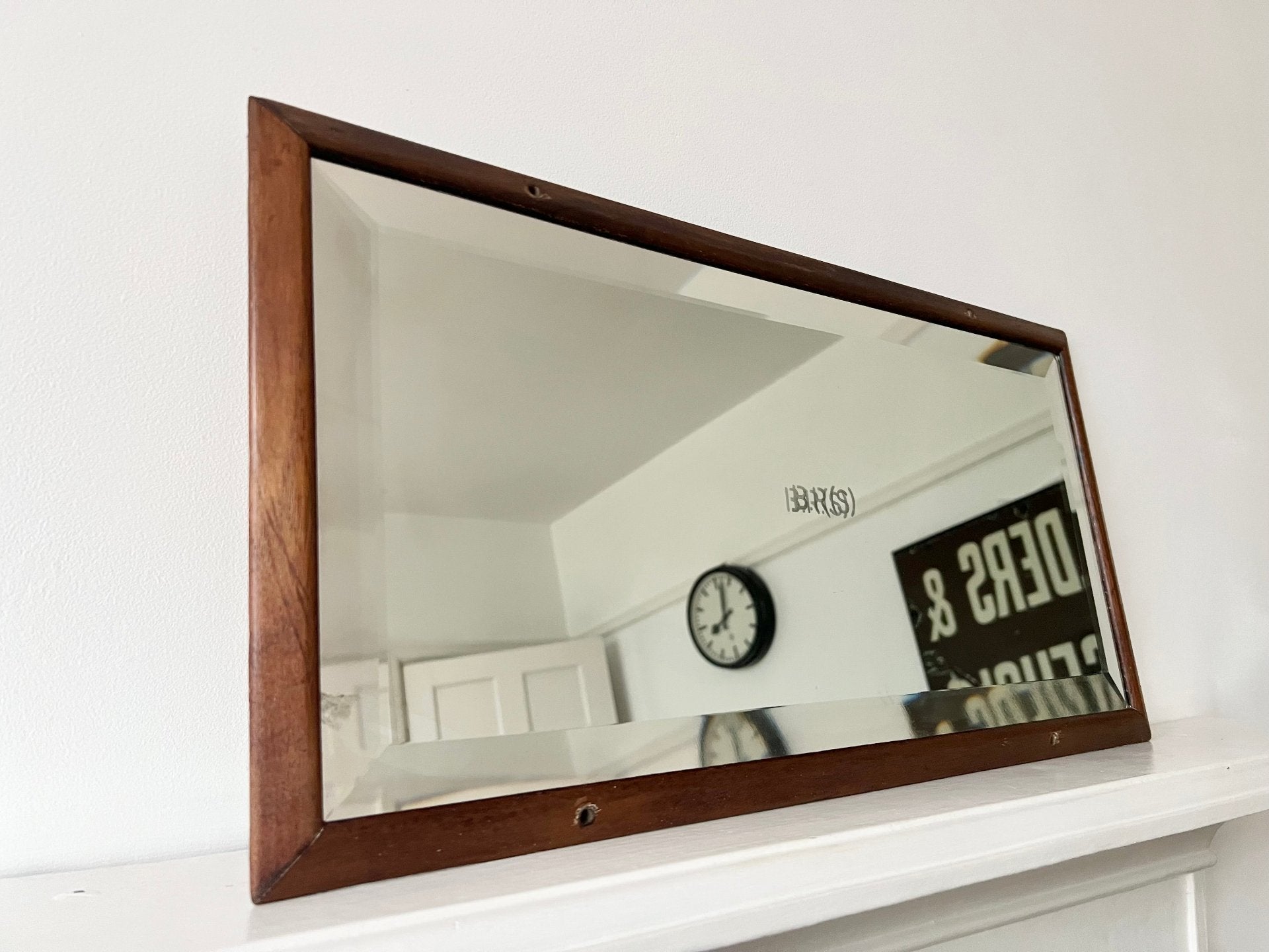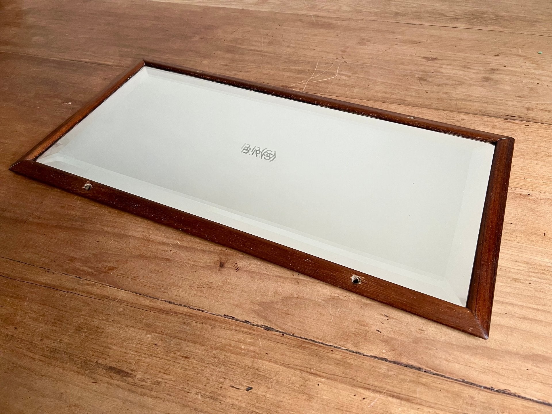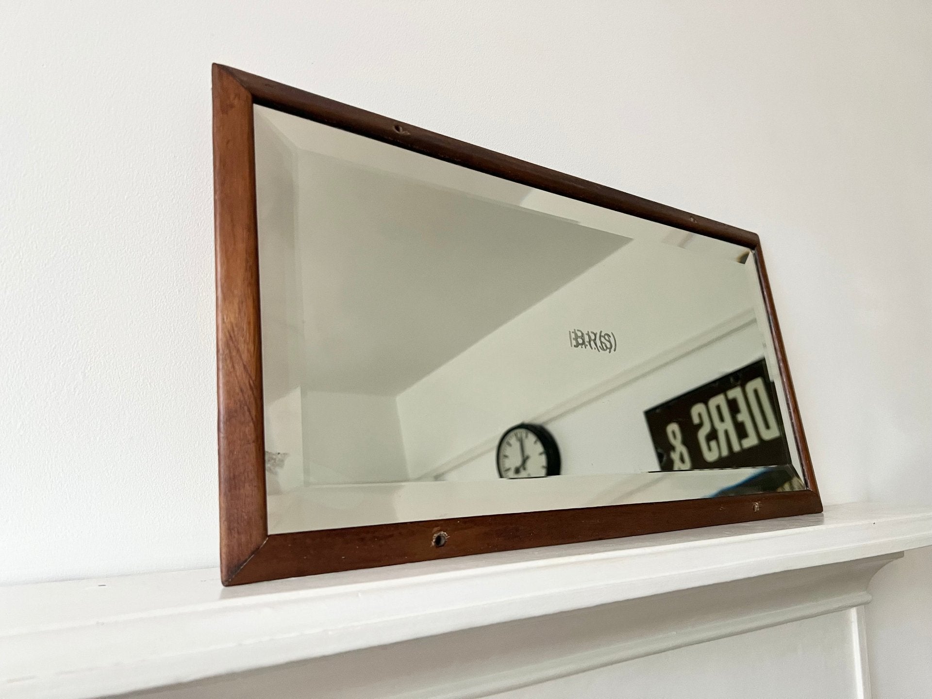 A great bevelled mirror in mahogany frame. This BR carriage mirror would have been part of the Southern branch of British Rail. With it's original Pilkington Silvered Glass, it's nice to have a bevelled example.