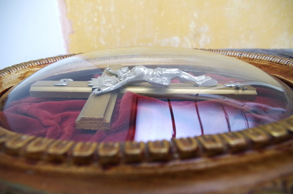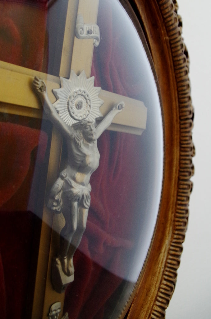 A lovely example of this kind, the crucifix with the Golgotha symbol is mounted on red velvet under convex glass with a plasterwork frame. It's in very good condition for its age. There is an inlaid metal loop for hanging. Postage and packaging is included in the price.