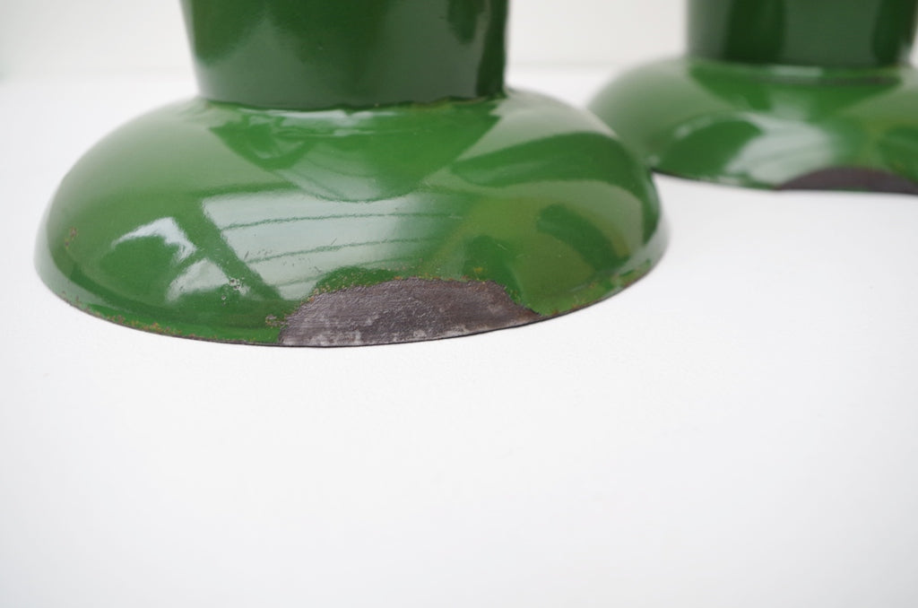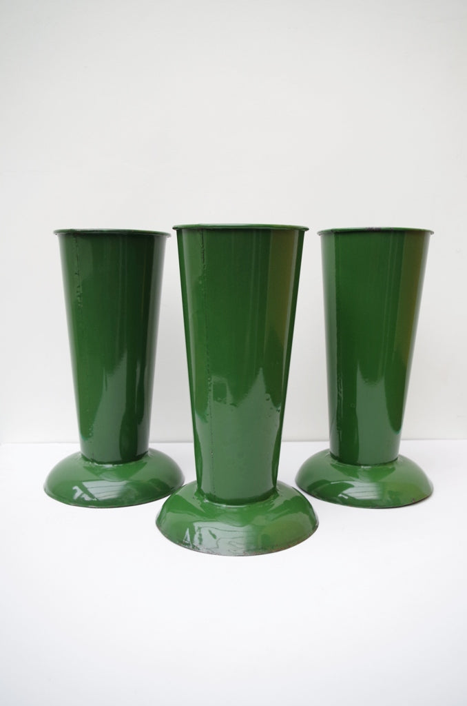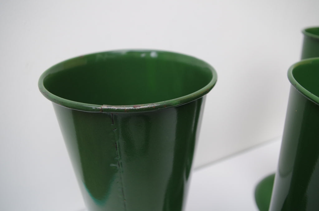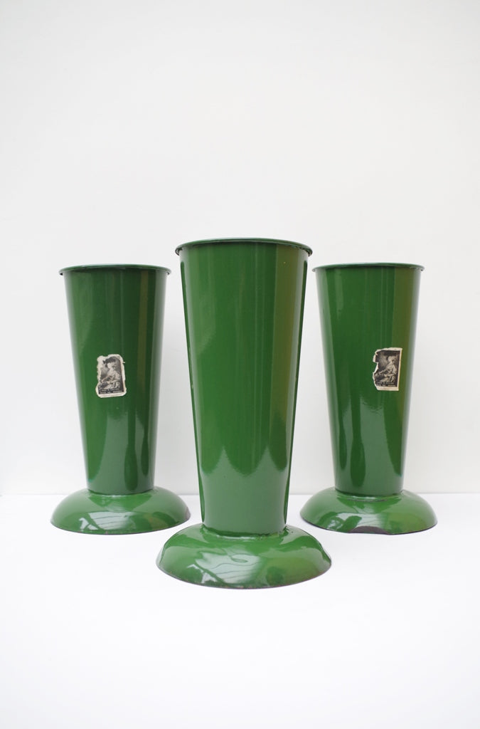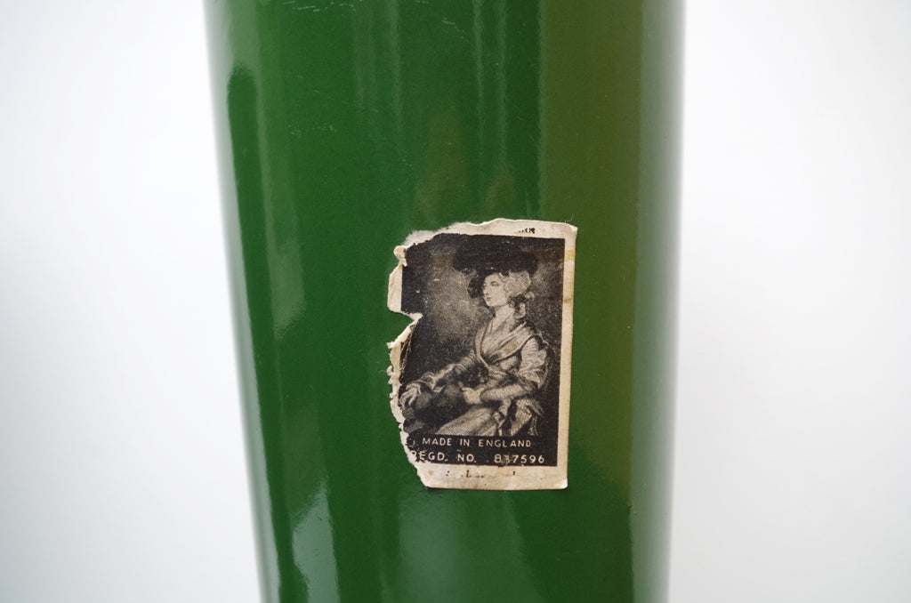 A decorative set of three enamelled florist vases patented to 1939/40. With little to no use. Two of which unusually still have their original manufacturing labels attacthed; depicting Gainsborough's Mrs. Siddon's on the registered logo. The royal green enamelling still remains vibrant and glossy.