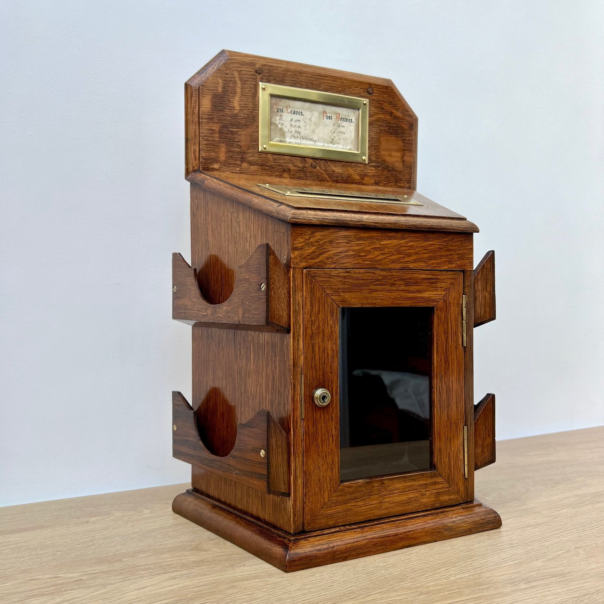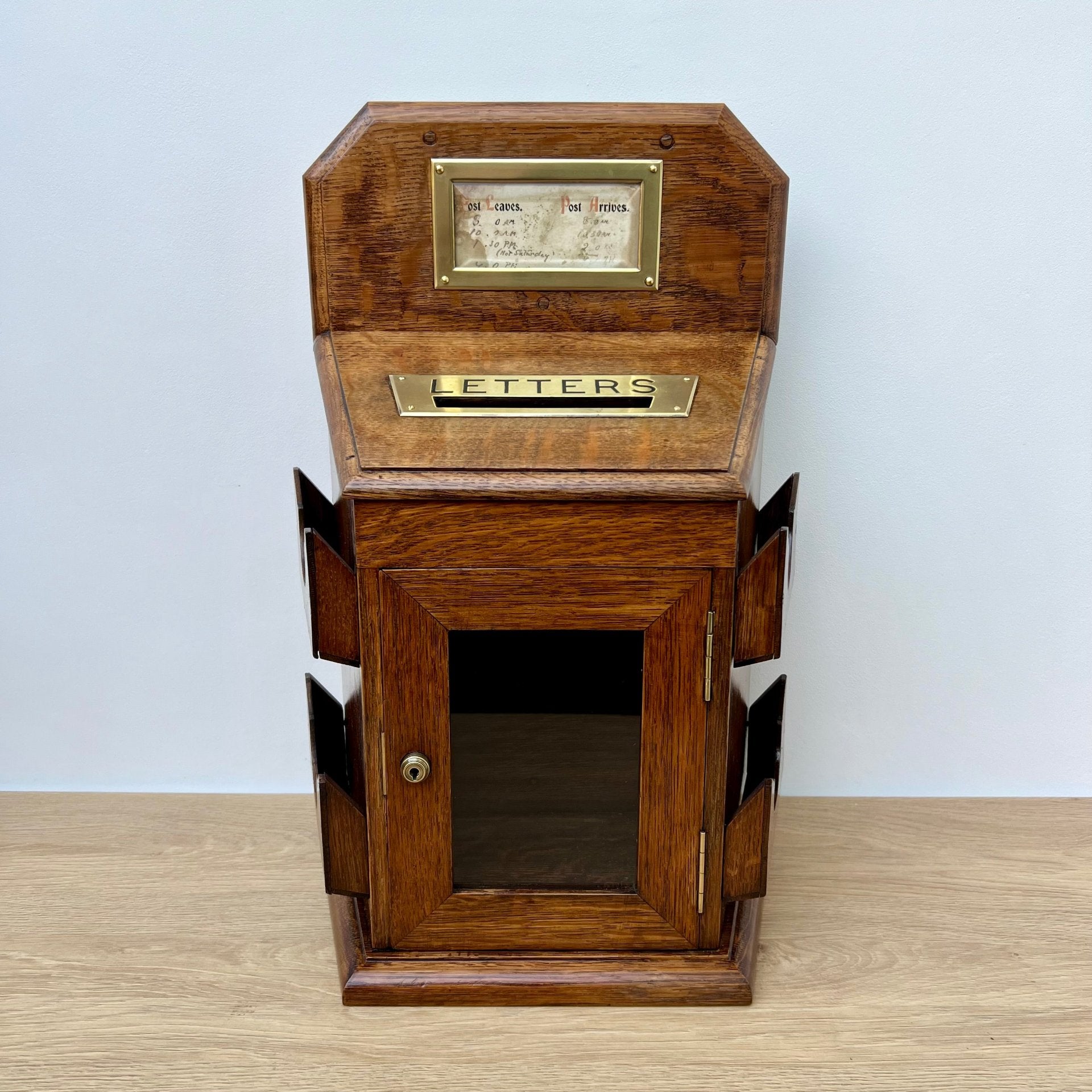 A beautiful country house estate letter posting box. An unusual form with side stationery racks and bevelled glass collection window. Retaining it's original Bramah lock but unfortunately has no key. The lock is currently open.