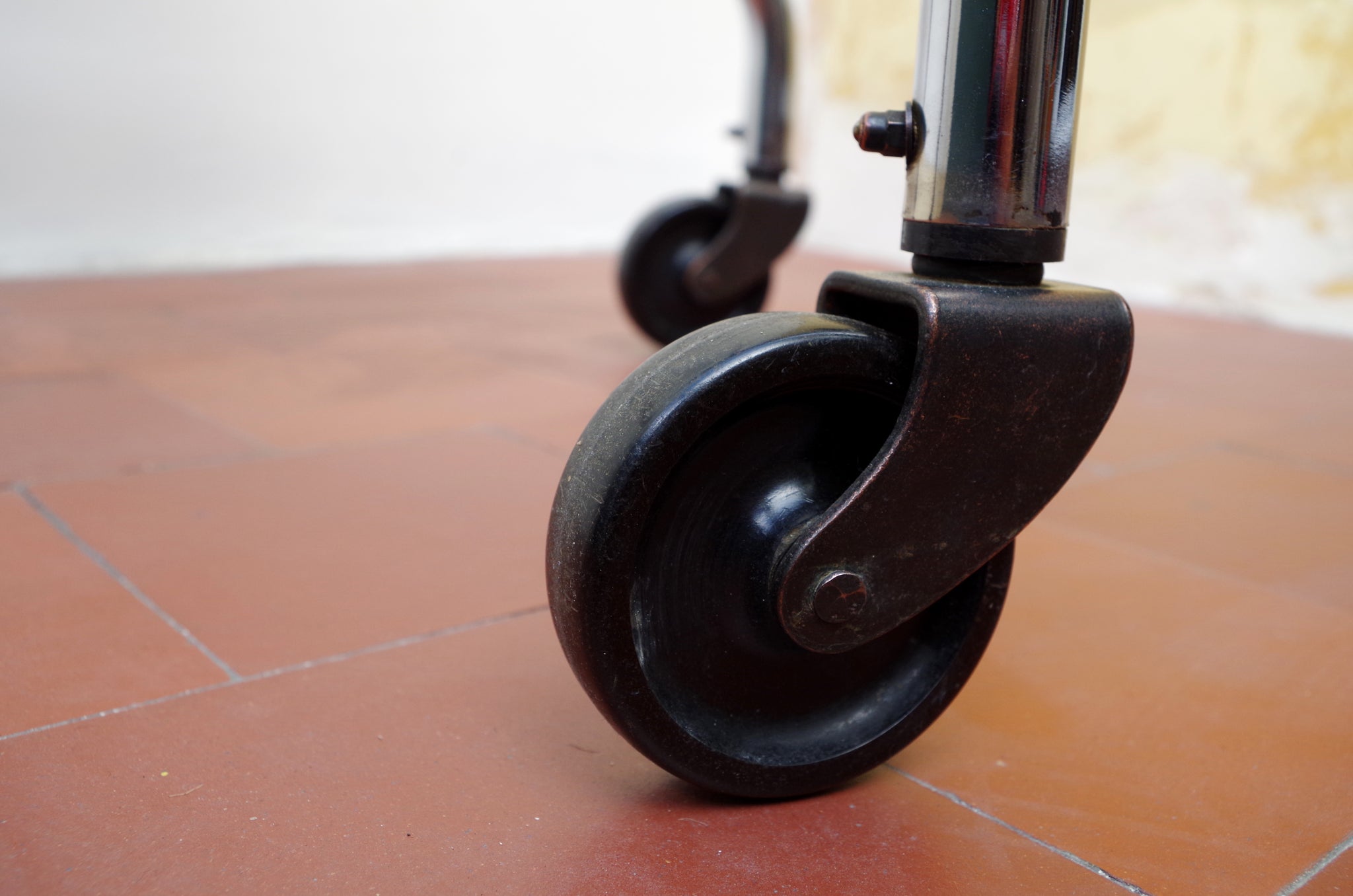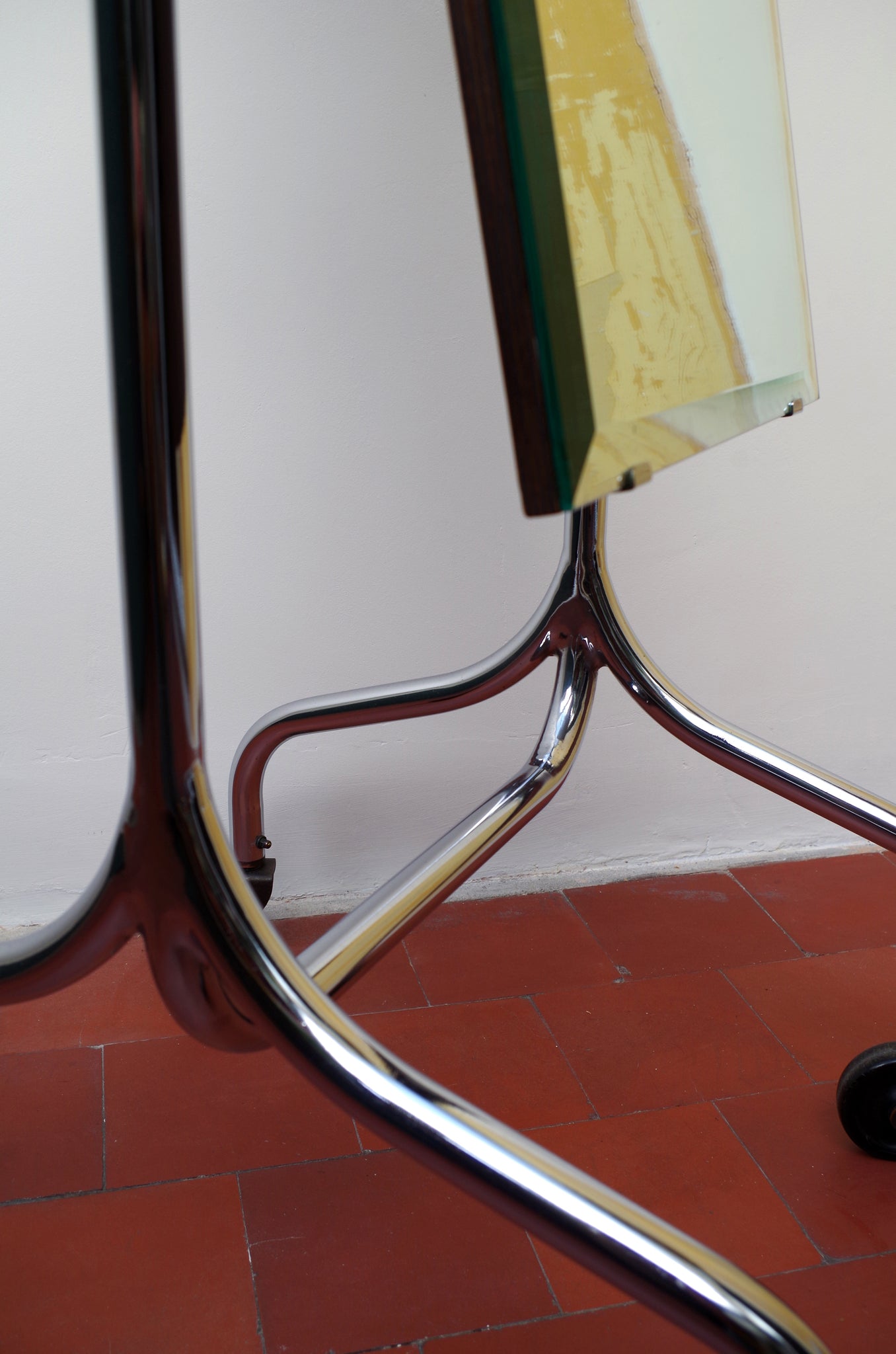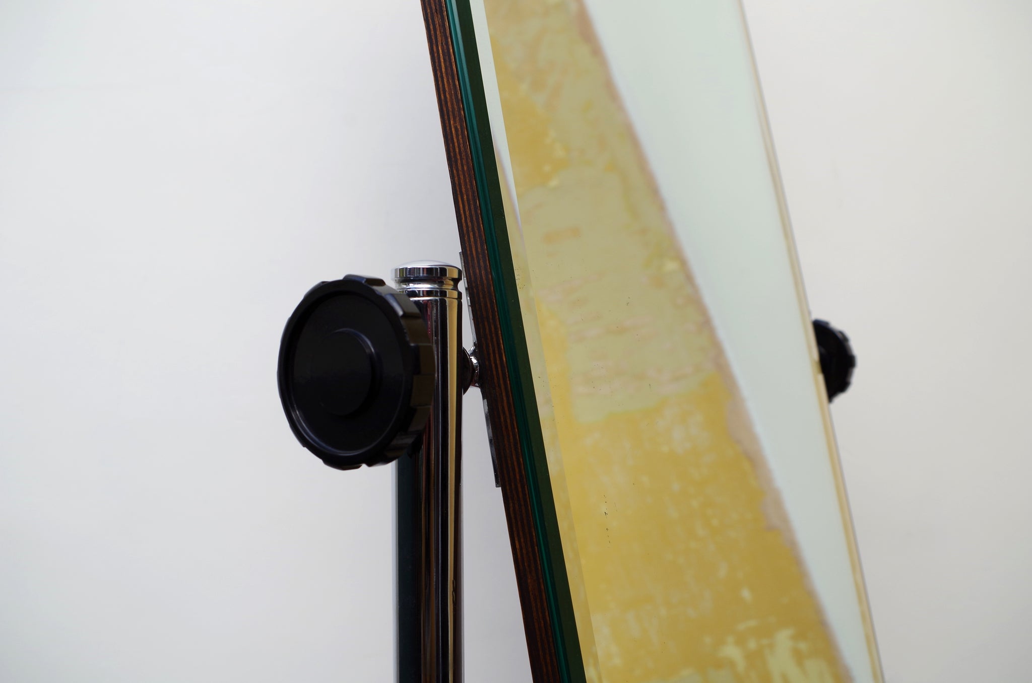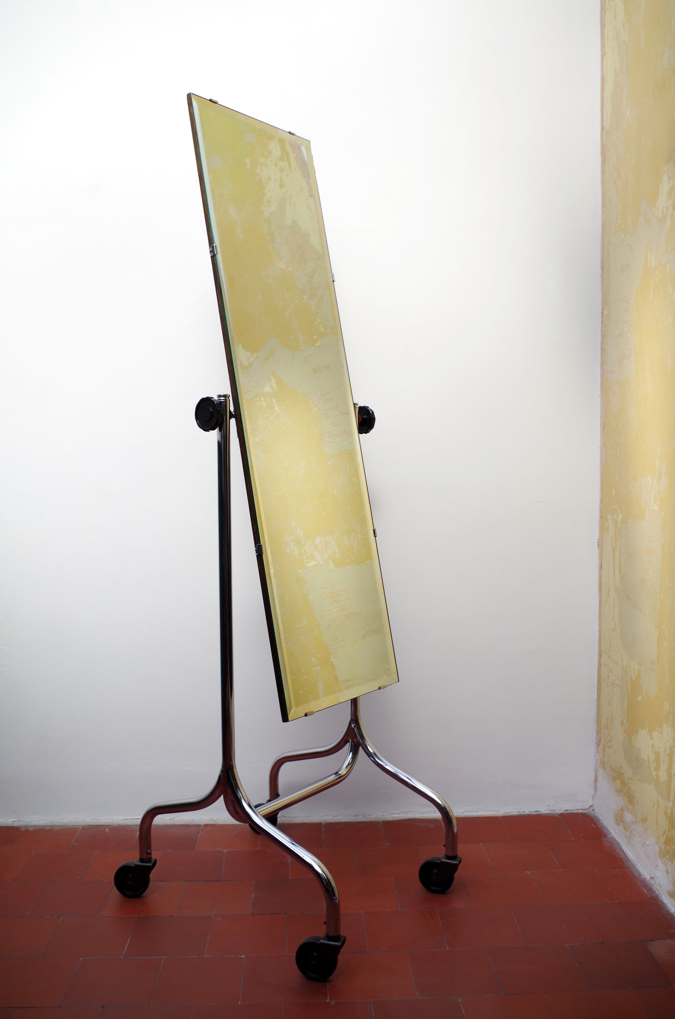 This is a Wonderful Example of a 1930's Chrome Cheval Shop Mirror with Bakelite Castors and Adjustable Handles.