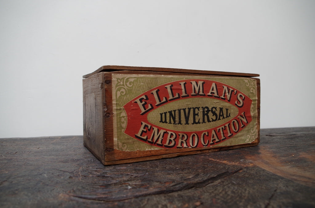 From a Pharmacist in Malvern, Worcestershire. This 'Shipping' box would have contained bottles of Elliman's Embrocation. Elliman's sold two types of embrocation, 'Universal' for humans and 'Royal' for animals. However, there were no difference in the two and the solution was made up of vinegar, eggs and turpentine!