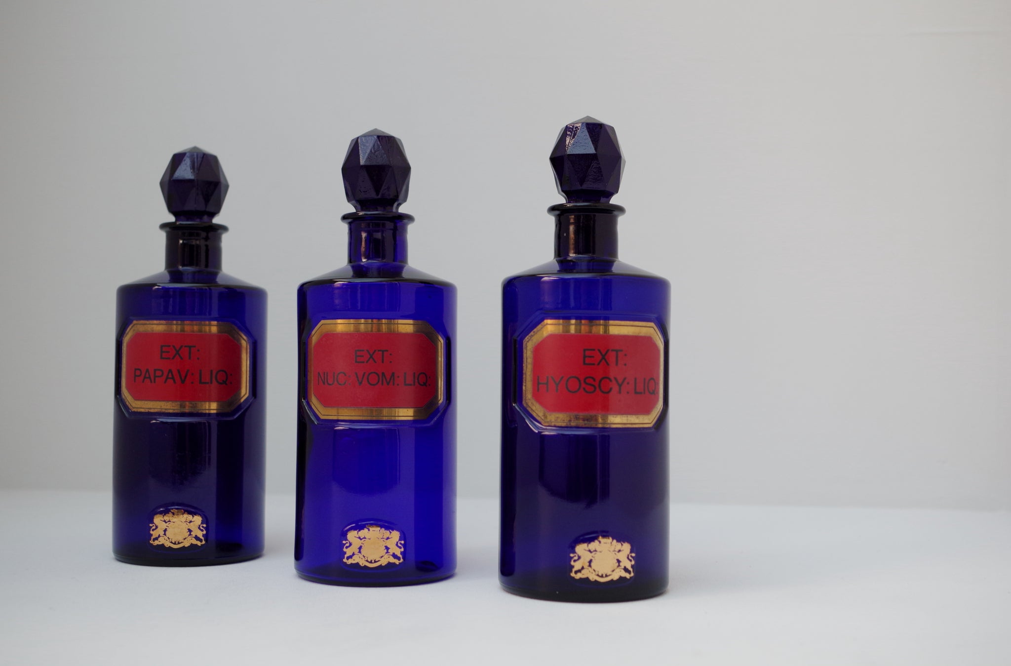 A beautiful set of three blue glass 'Extract' chemists' apothecary display/collectors bottles with the crest of The 'Worshipful Society of Apothecaries', in very good condition.