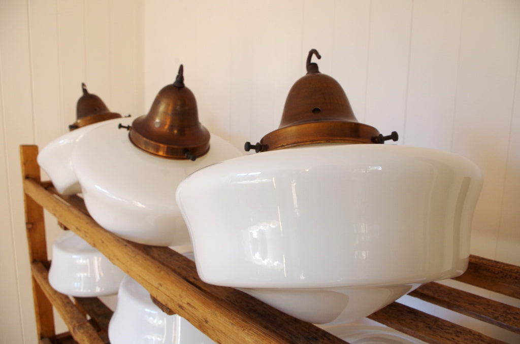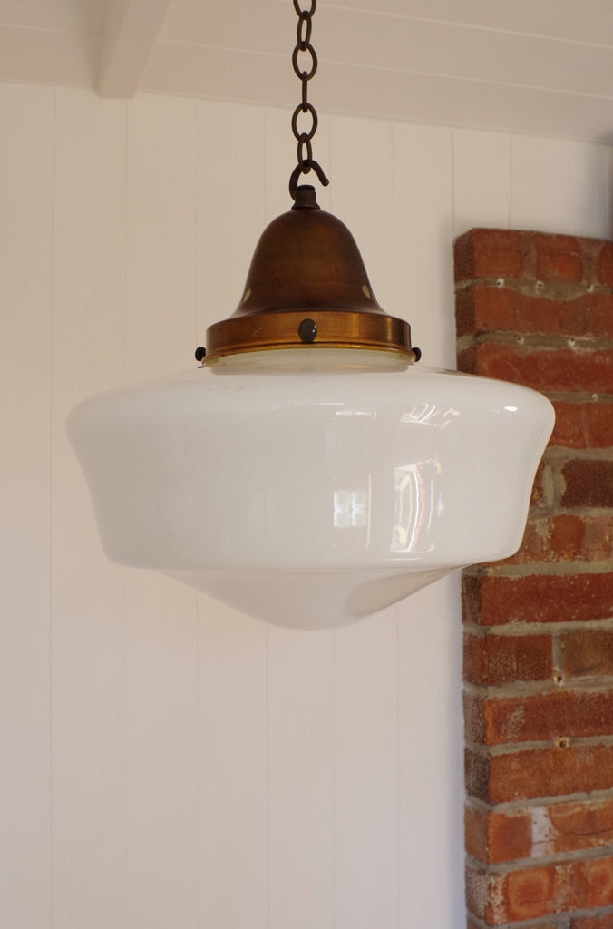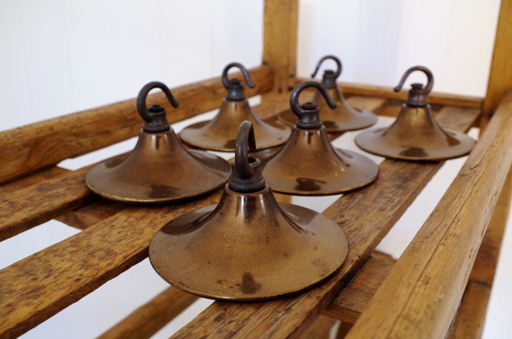 We have another lovely run of six pendants originally from a chapel in Herefordshire. Each with their original coppered brass galleries/bulb holders, ceiling hooks and chains. Priced each, please get in contact for further details/how to purchase.
