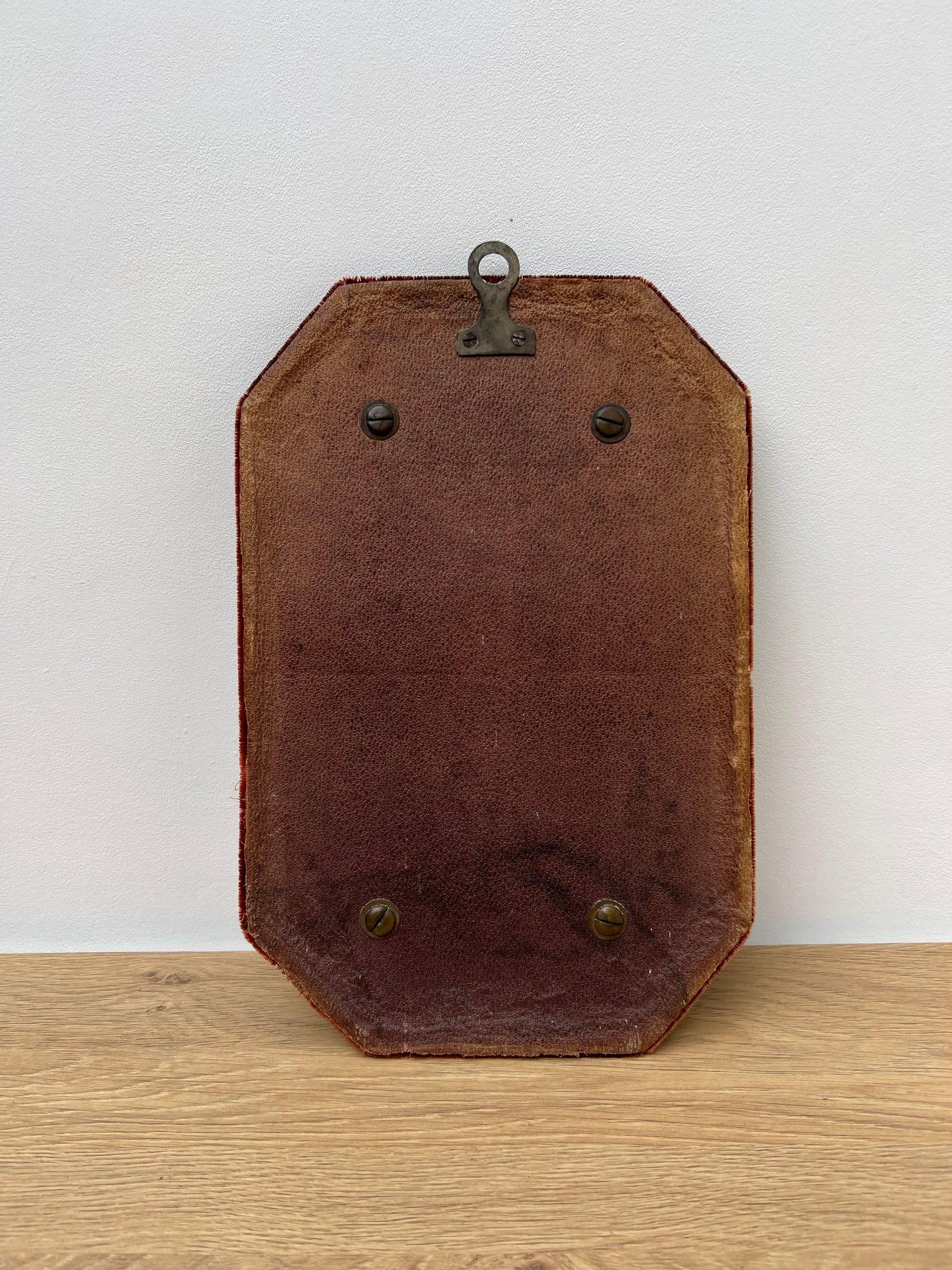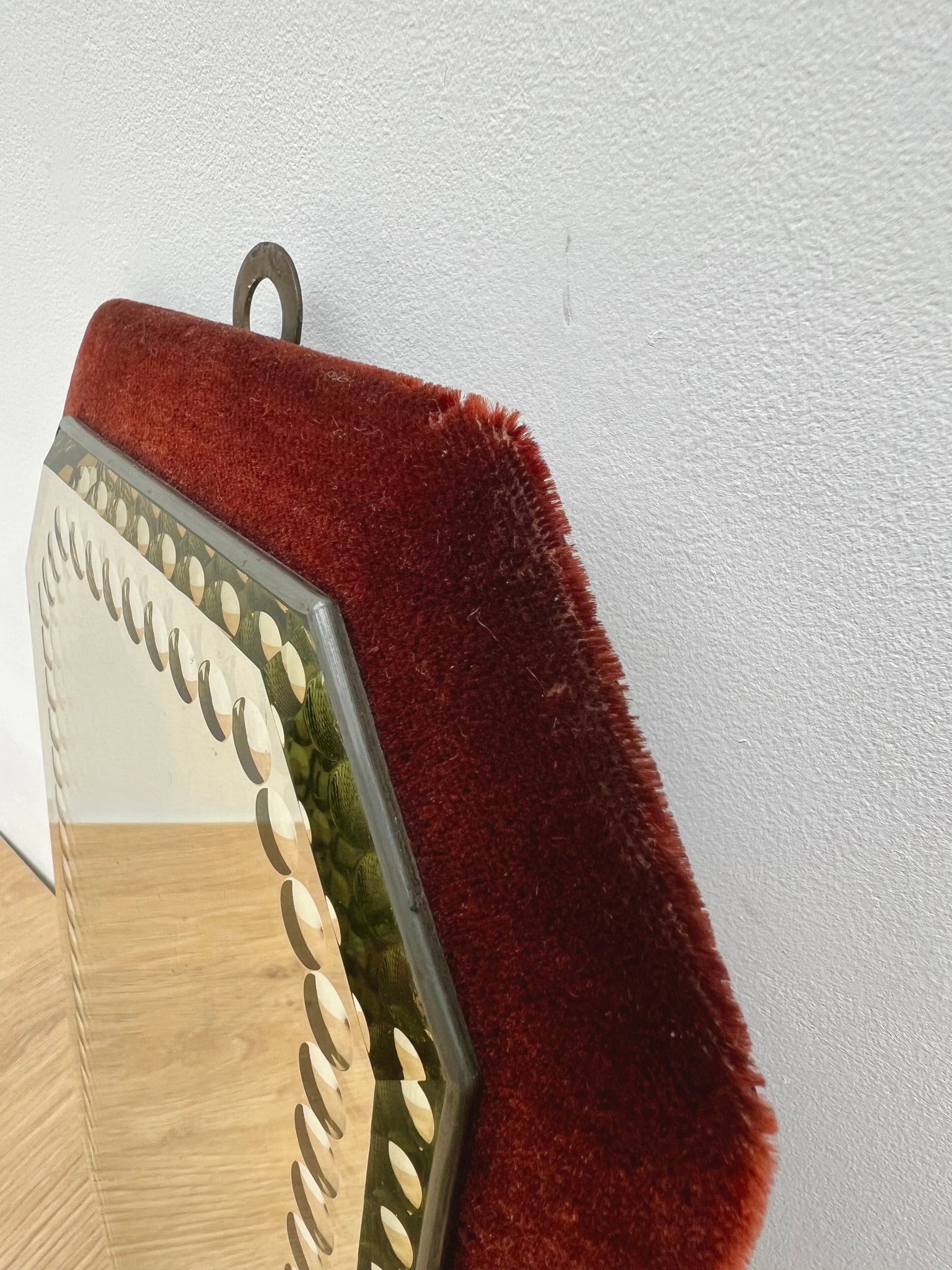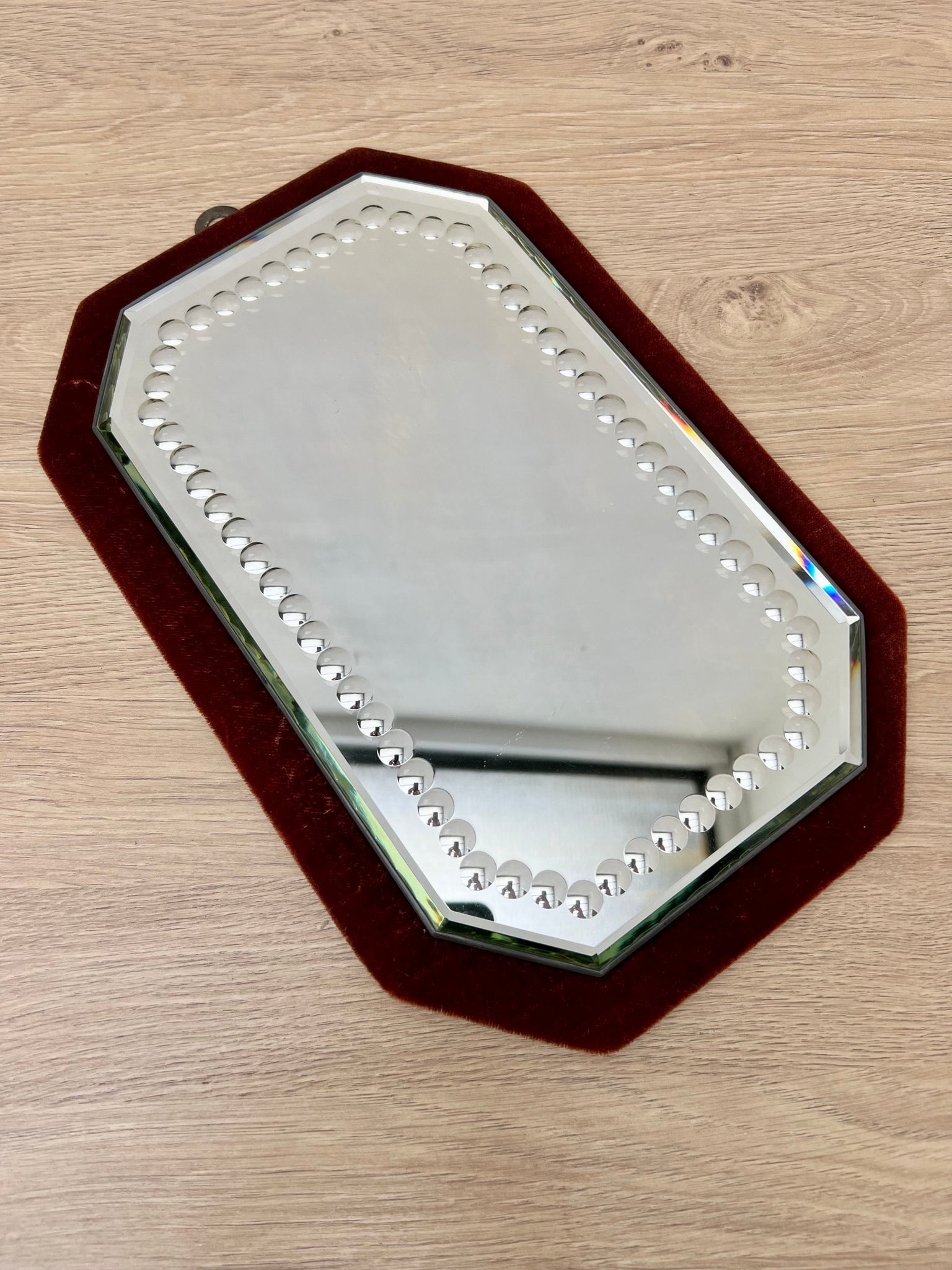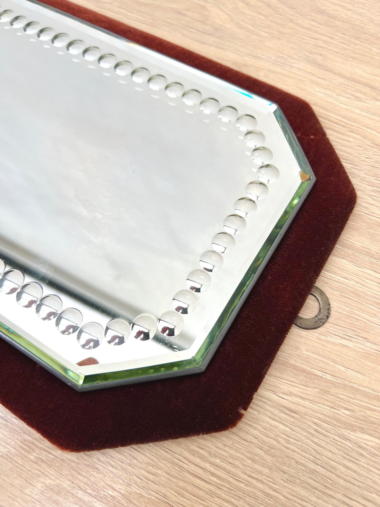 This late 19th century octagonal sorcerer's mirror is in great original condition, mounted against a deep red velvet pillow with wall-hanging fitting on the back.