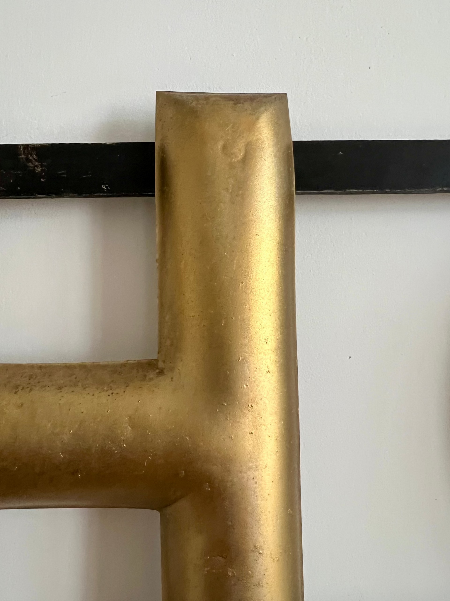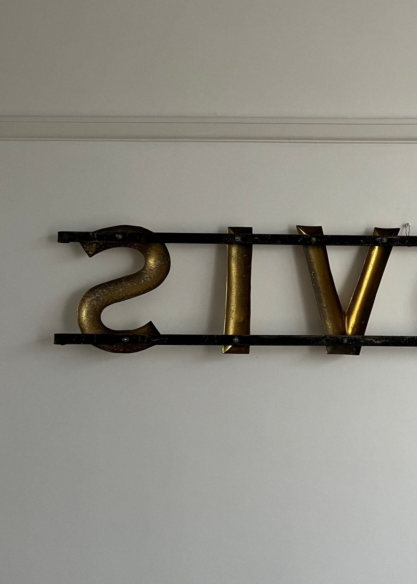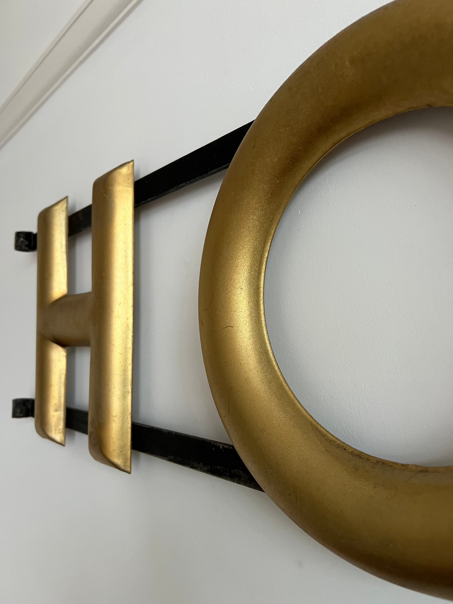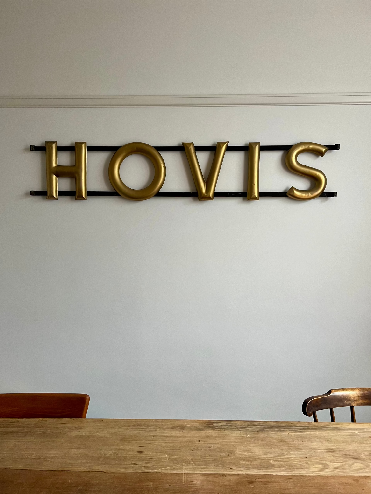 A great piece of original advertising. This wonderful vintage Hovis sign with three dimensional gilt lettering mounted on iron strapwork once adorned the outside of a bakery or general store. These signs were popular throughout UK highstreets, making it one of Hovis's more iconic non-painted signs in good overall condition.