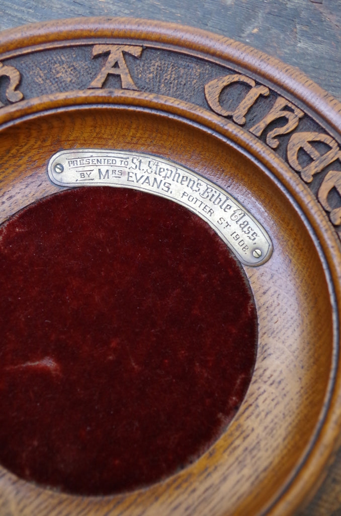 A beautiful oak church collection plate carved 'God Loveth A Cheerful Giver' with original velvet insert and engraved brass plate inscribed 'Presented to St. Stephen's Bible Class by Mrs Evans, Potter St 1908'.